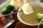 4、フォンデュ用の長いフォークに好みの野菜やパン、ソーセージ、ゆでウズラ卵、エビを突き刺し、チーズにからめていただく。