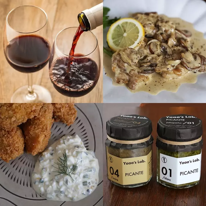 「ハラペーニョと生姜と柚子胡椒のタルタルソース」(左下)とポルチーニの深いコクが簡単に味わえる「鶏肉とキノコのクリーム煮」