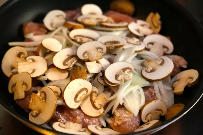 2、(1)と薄切りにしたマッシュルームと玉ねぎを加えて色づくまで炒める。