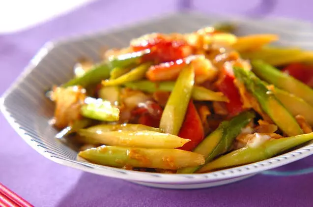 卵とアスパラたっぷりの炒め物です。最後に加える卵が他の素材の旨味を包み込んでくれます。マヨネーズで炒めるのもポイント!カニ風味のカマボコを加えると、彩りよく食卓も華やかに。肉類は入っていませんが、お腹満たされるメニューです。