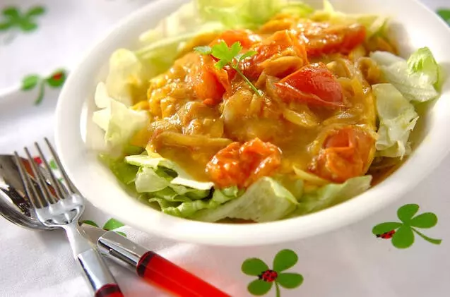 初めて出会う味かも?!卵やトマトのカレーにココナッツミルクを加えて、とってもマイルドに仕上げました。たっぷりのレタスと一緒にヘルシーにいただきます。4人分で卵を6~8個使うので、さらにマイルドな味わいに。卵液の合わせ方がポイントです。