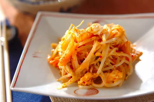 もやしとキムチを炒めて、卵液を炒め混ぜるだけのサッと作れる一品です。しかも、包丁&まな板いらずなので洗い物が少ないのも嬉しい!キムチ炒めのレパートリーが増えます。キムチの辛さが、卵と合わせる事でまろやかになりますよ。