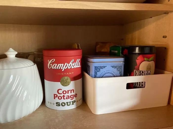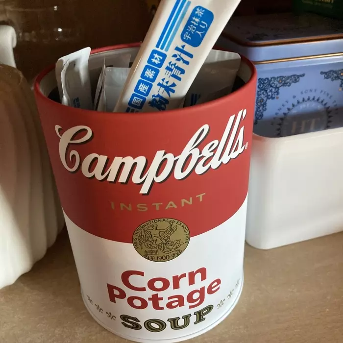 コーンポタージュをおいしくいただいたあとのキャニスター缶をどう使うかはアイディア次第。他にも、フライ返しやおたま、菜箸を入れて台所においてもオシャレ! キャンベルスープのデザインなのでキッチン周りでとてもフィットすると思いました。あなたならどこに置きますか?