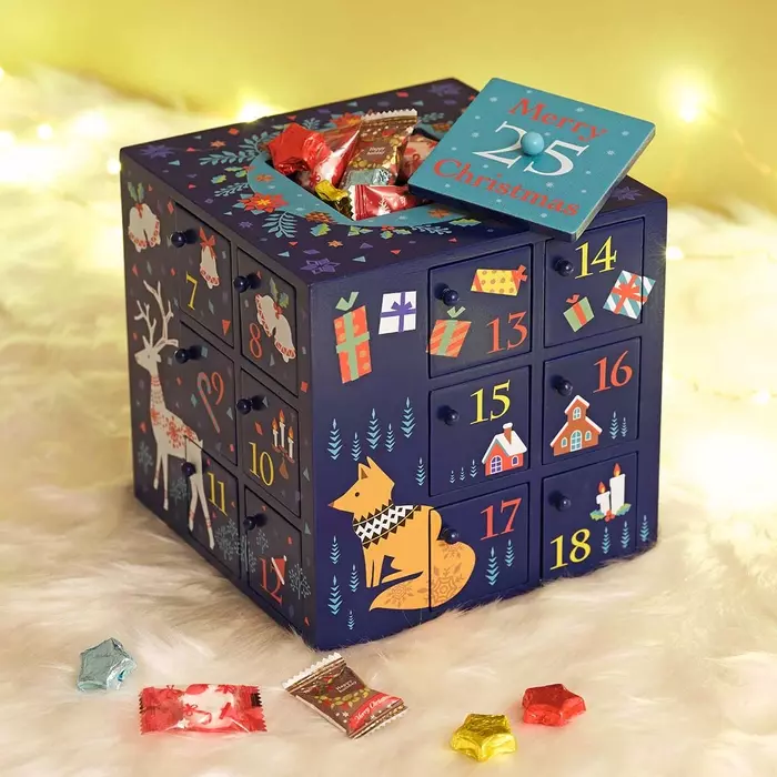 動物たちのイラストが可愛いらしい木製のカレンダーボックス。真ん中の大きなフタの中に25日分のお菓子が入っています。