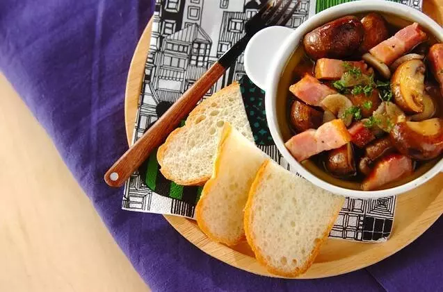 ・マッシュルームと厚切りベーコンのアヒージョ