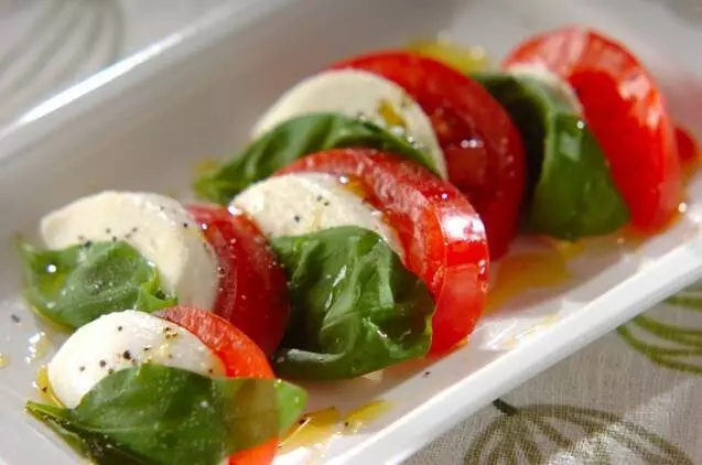 赤・白・緑の色合いが美しいカプレーゼ。おもてなしで喜ばれるイタリアンの前菜です。たっぷりのオリーブオイルを回しかけて、お皿にとりわけ食べる直前にトリュフ塩をかけると香りがたちます。