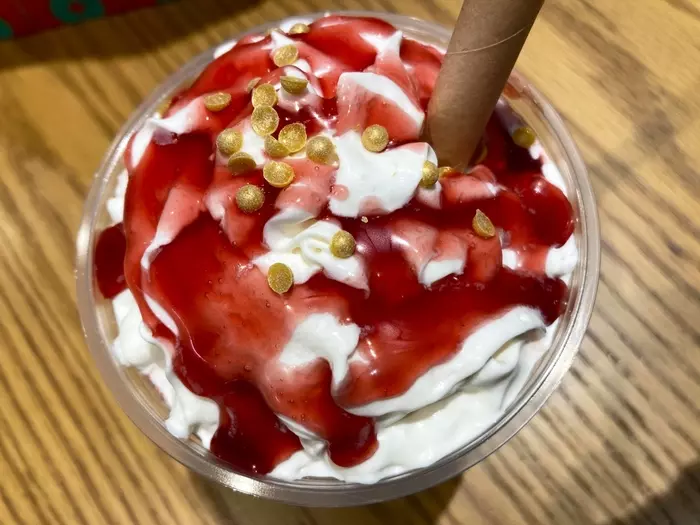 アメリカやイギリスで親しまれているという「レッドベルベットケーキ」をまるごとフラペチーノにしたようなワクワクのドリンクです。
