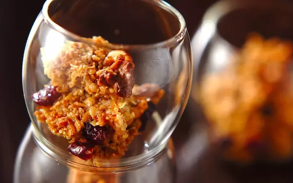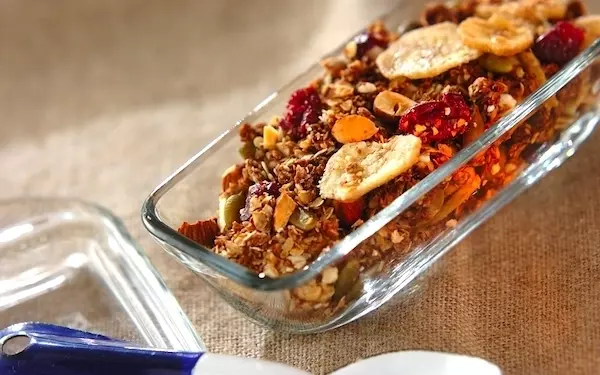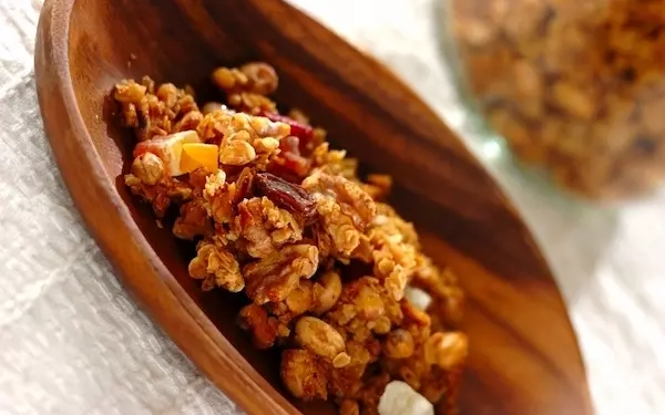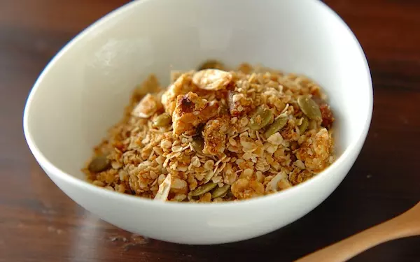 オートミールが初めてという人にピッタリなのがこちらのレシピです。クルミ、スライスアーモンド、パンプキンシード、小麦胚芽、イチジク、アプリコット、シナモンパウダー、塩が入ったグラノーラ。食べやすく栄養満点で、朝食にも最適です。健康・美容効果も期待できます。