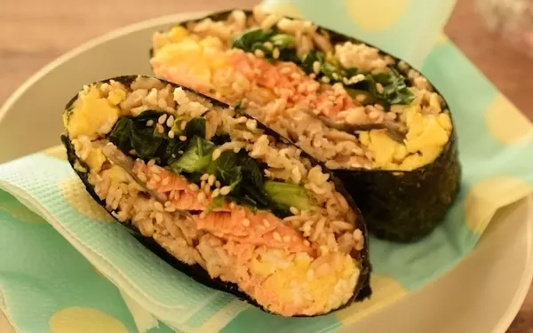 焼き鮭と小松菜をサンドした栄養バランスの良いおにぎらずです。ヘルシーな食事にしたいときや、ダイエット中の朝食にピッタリ! 仕上げに、ラップをつけたまま、半分に切り、切り口に白ごまを振りましょう。見た目も鮮やかで食欲をそそられますよ。