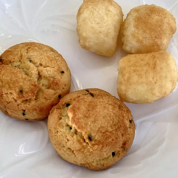 チーズの風味をしっかり感じることのできる「ごまチーズスコーン」。もぐもぐと噛むと、プチプチっとゴマが弾けて面白い食感です。コーヒーや紅茶とともに、おやつタイムに食べたいお菓子です。※こちらも人間用です。