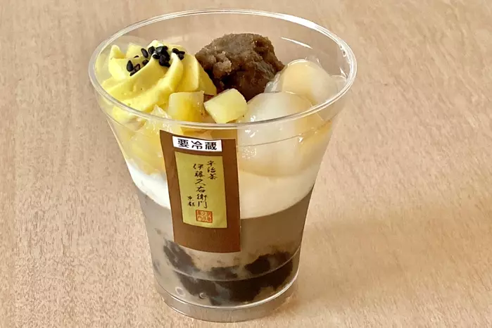 セブンイレブンのスイーツコーナーでひときわ目を引いていたこちらのパフェ。お芋のホイップに角切りさつまいも、白玉、あんこが乗った豪華なビジュアルもさることながら、「伊藤久右衛門監修」という文字に“はく”を感じずにはいられませんでした。