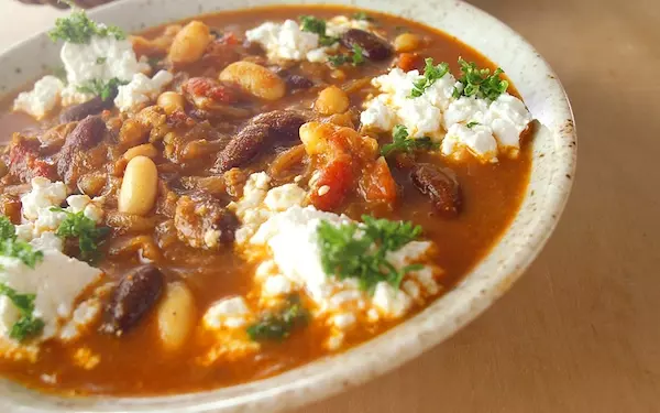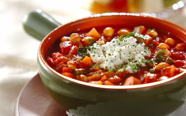 チリコンカンは、角切りにしたたっぷりの野菜をグツグツ煮込んだメキシコ料理です。ボリューム満点で、子どもはもちろん、男性からも人気のメニュー。仕上げに、カッテージチーズ、ドライパセリを散らしてから召し上がれ! トマトの酸味が程よく効いた、アツアツで食べたい料理です。
