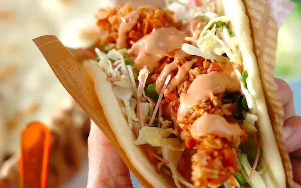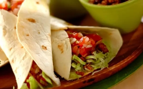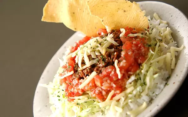 実は、タコライスは沖縄で誕生した料理です。しかし、メキシカン要素が満載! タコス料理に欠かせないサルサソースとジューシーな肉がよく合います。仕上げに、ピザ用チーズ、ドライパセリを振って、トルティーヤを盛りましょう。