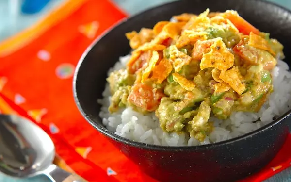 栄養価の高いアボカドを使ったワカモレを丼に。スパイシーな香りが食欲をそそります。最後に、砕いたトルティーヤチップを散らしましょう。冷めてから食べても美味しい一品です。お好みで、タバスコをどうぞ。10分で作れるので時間がないときにも最適です。