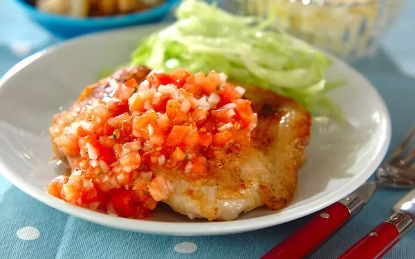 刻んで混ぜるだけのサルサソースをカリッと焼いた鶏もも肉にのせた一品です。さっぱりとしたサルサソースで爽やかに味わえますよ。ピリ辛なタバスコがアクセントに。ご飯はもちろん、パンと一緒に食べても良さそうです。