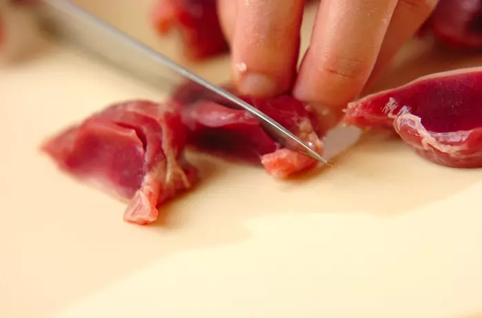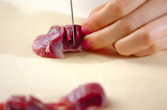 難しそうな砂肝の下処理。実はとっても簡単なんです。砂肝の下処理方法は、砂肝の周りにある白い部分を削ぎ落とすだけ。調理の際に身の厚い部分に切り込みを入れ、分量外の酒をからめます。