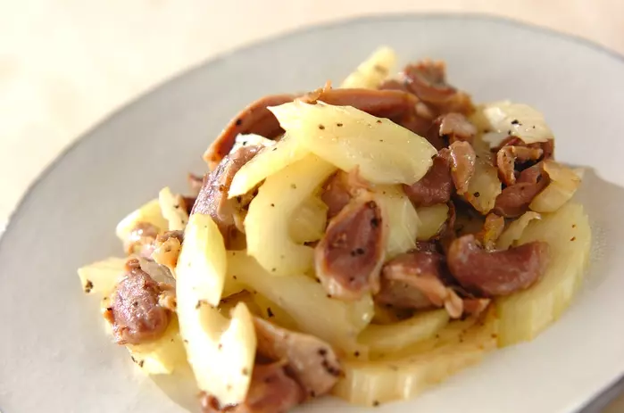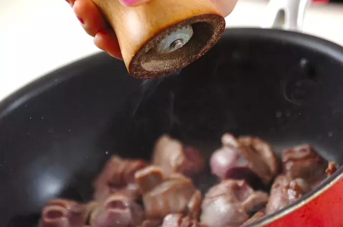 1、フライパンにサラダ油を中火で熱して砂肝を炒め、塩コショウをする。器に盛り、半分に切ったレモンを添える。