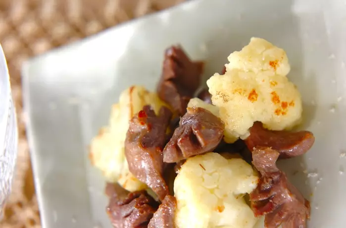 カリカリとホクホクふたつの食感が楽しめる砂肝とカリフラワーのバターソテー。仕上げにハーブソルトをかけると味が引き締まります。