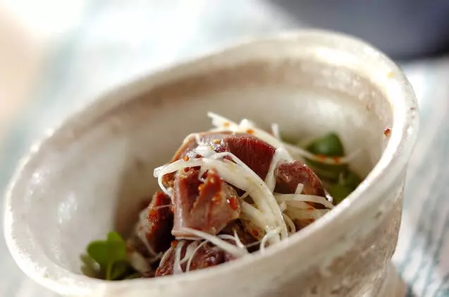 白ネギと貝われ菜にラー油をからめるのがポイントです。サニーレタスやミニトマトなど彩りが良い一品ですね。ピリ辛ネギと砂肝の組み合わせはついついビールが飲みたくなります。