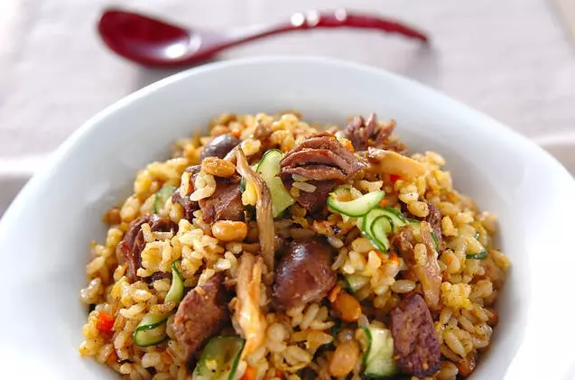 キュウリと砂肝はコリコリ、レバーと納豆はもちっと食感が楽しめます。納豆の粘りはほとんどないので食べやすいチャーハンです。