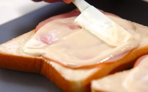 4、食パンに3の<ベシャメルソース>をぬる。ハムをはさみ、食パンをのせる。