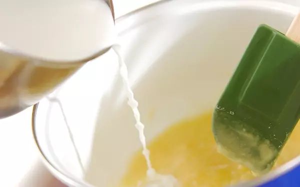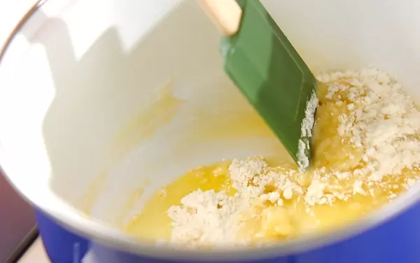 2、無塩バターと薄力粉がなじんでペースト状になったら、温めた牛乳を少しずつ加え、そのつどなめらかになるまで混ぜる。