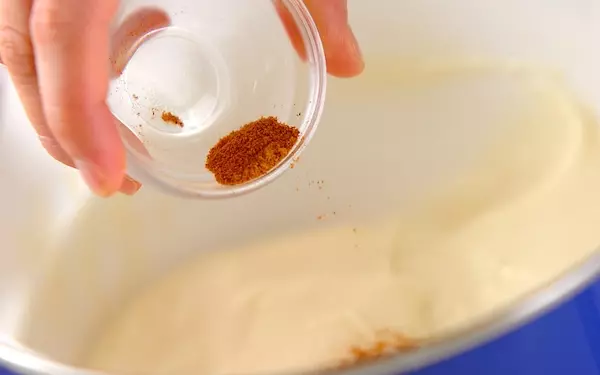 3、トロミがついてきたら、塩、ナツメグを加えて味を調える。