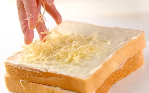 1、食パンに1/4量のホワイトソースをぬり広げ、ハムをのせる。さらに1/4量のホワイトソースをのせて食パンではさむ。