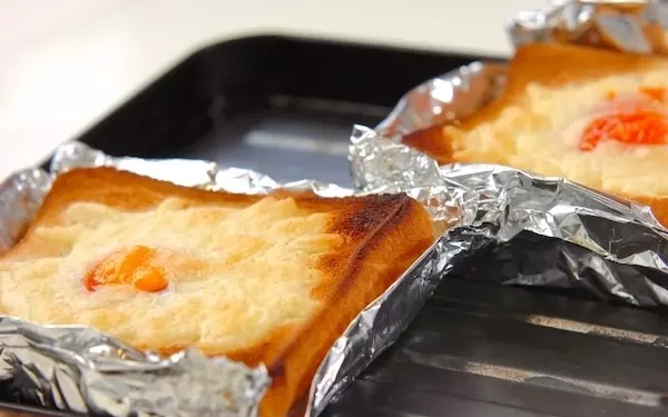 3、アルミホイルにのせてトースターで卵が半熟になるまで焼く。器にのせ、ドライパセリを振る。