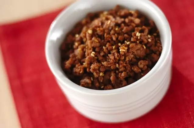 醤油とみりんで作る甘辛味のそぼろ。味付けを焼肉のたれに変えてサンチュに合わせても。