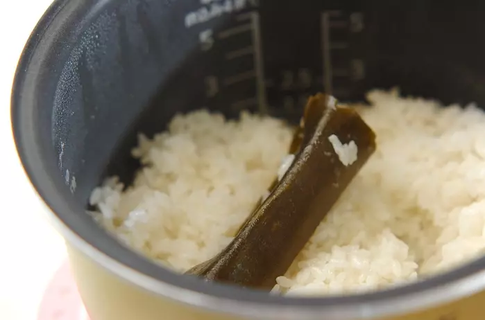 お米は水洗いしてザルに上げておきます。炊飯器に洗い米を入れ昆布と水を入れて炊きあげます。炊きあがったら昆布を取り出し、10~15分蒸らします。