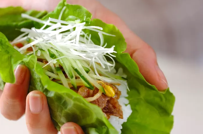 サラダ菜やレタスでくるっと巻いて。