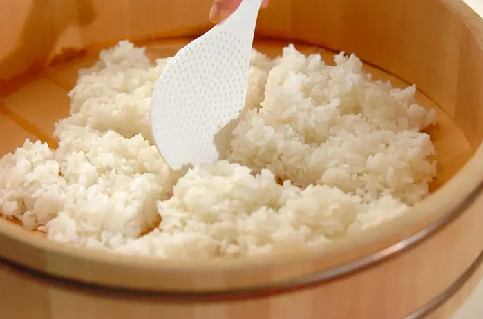 ※手早く混ぜながら冷ますのは、ご飯の中にたまっている湯気を出して余分な蒸気を逃がし、寿司飯がベタつかないようにする為です。