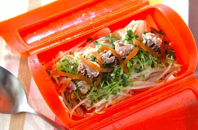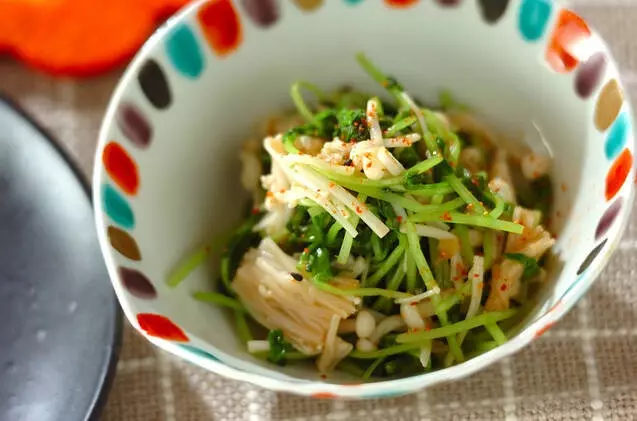 ピカタの赤と黄色に合わせて緑が美しい豆苗を和え物に。キノコ類の中で栄養価が高いエノキを合わせます。エノキは冷凍可能なのでほぐして冷凍しておくとすぐ使えて便利です。