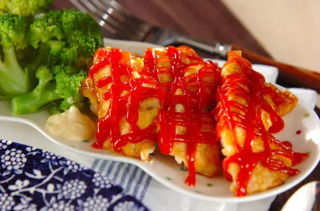 一週間のはじまり月曜日。鶏むね肉をそぎ切りにして卵液を絡めたピカタをメインに献立を考えます。ピカタは見た目が華やかで簡単に作れる万能レシピ。ケチャップをかけて彩りよく盛り付けます。
