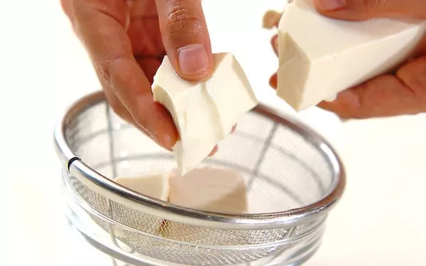 ・豆腐はサッと水洗いし、手でザックリ割ってザルに上げる。