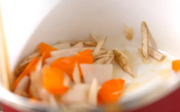 1、鍋にゴマ油を強火で熱し、大根、ニンジン、水気をきったゴボウを炒め合わせる。