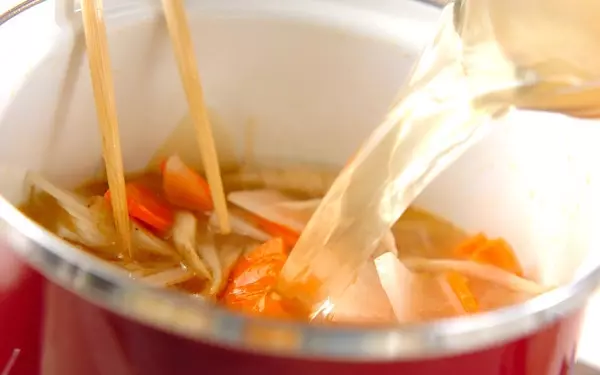 2、全体に油がまわったら、だし汁を加えて煮立て、火を弱めて10分くらい煮る。具が柔らかくなるまで煮ます。