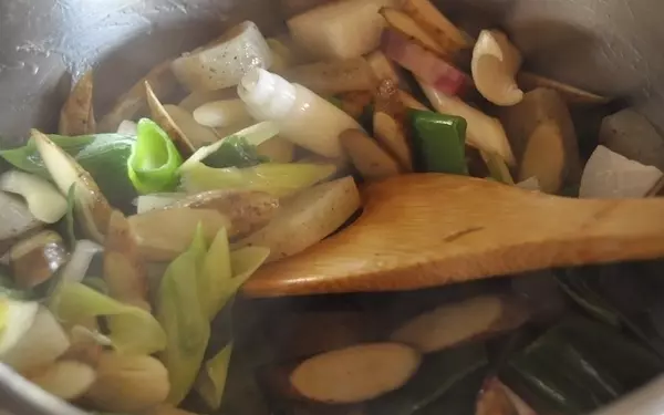 1、鍋にサラダ油を熱し、大根、ニンジン、ゴボウ、ネギ、板コンニャクを炒め合わせる。だし汁を加え、煮たったら火を弱めてアクを取り、鍋に蓋をして10分煮る。