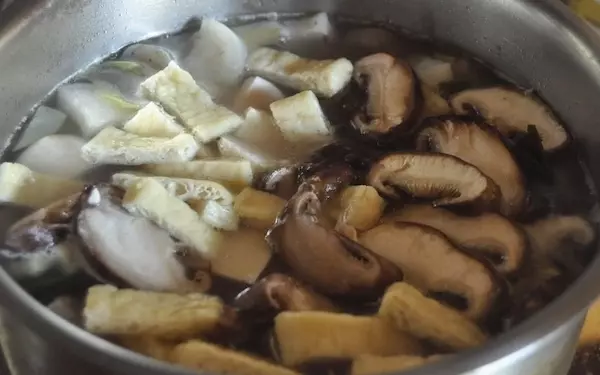2、里芋、シイタケ、油揚げ、ショウガ汁を加える。里芋に火が通ったら木綿豆腐を加え、みそと練り白ゴマを溶き入れる。器に注ぎ、ネギをのせる。