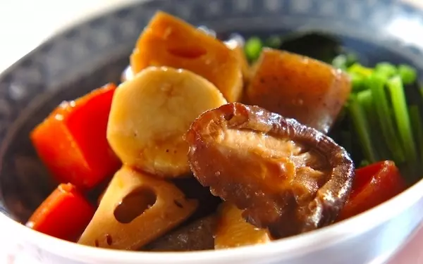 ニンジンやホウレン草を合わせて彩りを良くした根菜の煮物です。具材にだしがしっかりしみ込み、コクがあります。けんちん汁のアクセントになりそうな一品です。鍋いっぱい作って、翌日、お弁当に入れるのもいいでしょう。