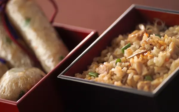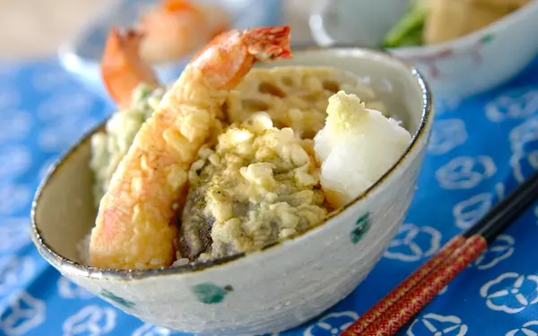 エビにシイタケ、レンコン、大葉を使った天丼です。ボリューム満点で食べ応え十分! お好みで、粉山椒をかけてもいいでしょう。サクサク衣と甘辛のかけつゆが見事にマッチ。後を引く味わいです。