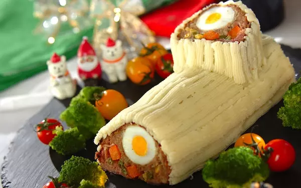 ミートローフをブッシュドノエル風にアレンジした、ユニークで美味しい一品です。見た目のインパクトも大! ミートローフはマッシュポテトとの相性もバッチリです。おうちでのクリスマスパーティーはもちろん、持ち寄りにも◎です。お好みで、クリスマス用ピックを刺し、ブロッコリーとプチトマトを飾ってくださいね。