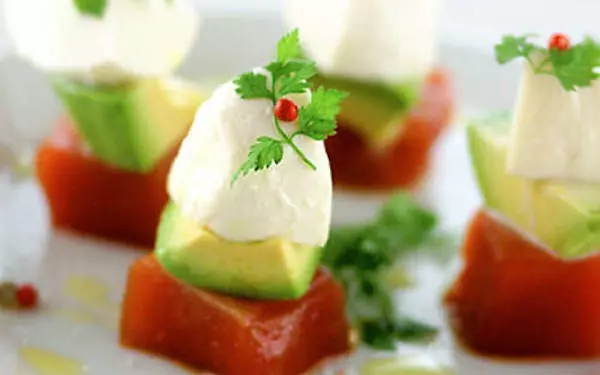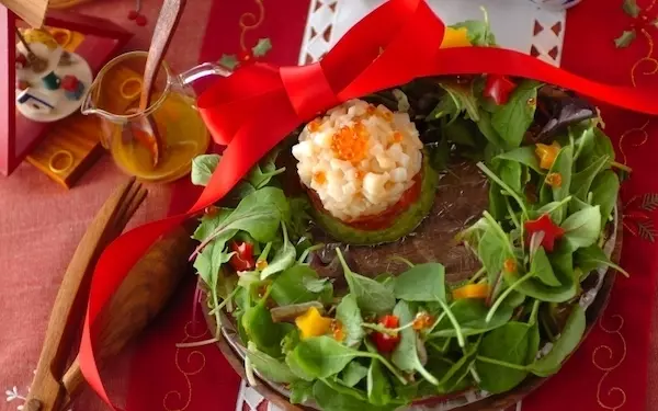 モッツァレラとマグロ、アボカドを組み合わせた豪華な前菜です。マグロはつけダレに10分漬けるのがポイント。一口頬張ると、とろけそうになる味わいに驚かされますよ。セルフィーユとピンクペッパーを飾れば、クリスマスらしさが一気にアップ!