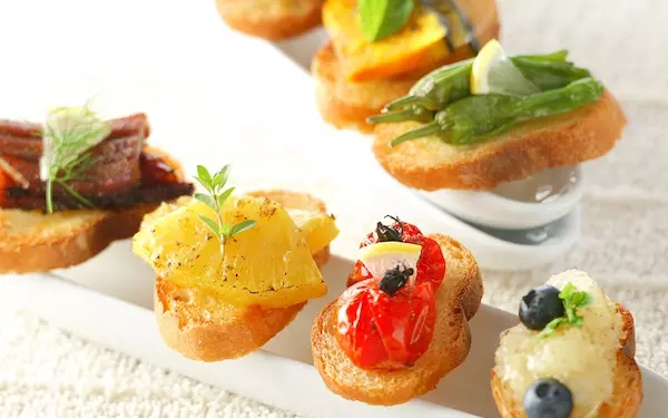 ミニトマト、カボチャ、シシトウ、ナス、アナゴ、カマンベールチーズ、パイナップなどを使った彩り鮮やかなオードブルを作ってみませんか? こんがりと焼いたガーリックトーストにさまざまな具材がのっていて、バラエティに富んだ風味を楽しめます。スパークリングワインとの相性も◎。