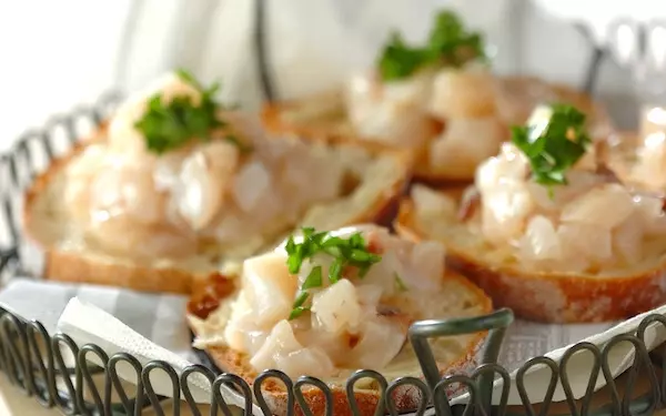 サクッと焼いたバケットにホタテとアンチョビをのせたリッチなカナッペ。ホタテの甘みとアンチョビの塩気が見事にマッチし、たまらない美味しさです。最後にイタリアンパセリを散らすと、よりオシャレに。15分で簡単に作れるのもうれしいですね。