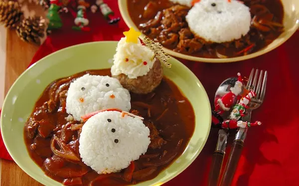 今年のイブとクリスマスは土曜日・日曜日です。少し時間に余裕があるのなら、クリスマスディナーにこちらのカレーを作るのもいいかもしれませんね。子どもが大好きなハンバーグとカレー、マッシュポテトで、大喜びしてくれそう。ご飯で作った雪だるまもかわいらしいです。