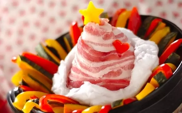 クリスマスディナーに鍋はいかがでしょうか。クリスマスツリーに見立てた、豚バラ肉で作ったタワーには圧巻です。綿菓子は見た目だけでなく、トマトの酸味を和らげて、小さな子どもも食べやすくなります。〆にご飯やパスタを入れても美味です。トマト鍋スープの素を使うので、パパッと作れますよ。