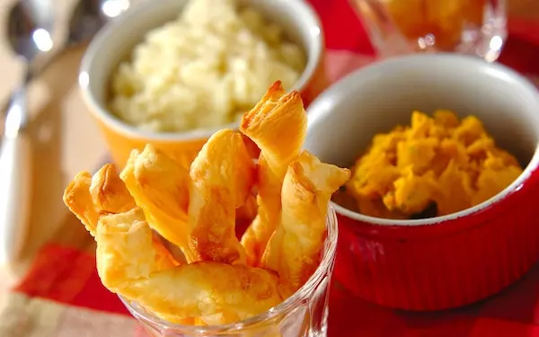 冷凍パイシートをねじって焼いたスティックを、カボチャの甘いディップとワサビの辛さが効いたジャガイモのディップをつけて食べる簡単前菜です。砂糖とワサビの量をそれぞれ調整すれば、お好みの甘さと辛さにできます。スティックはグラスに入れるとパーティー仕様に。