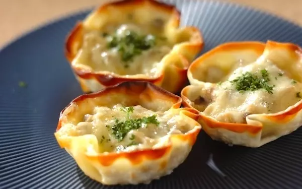余った餃子の皮で作れるお手軽レシピ。少しだけ手を加えることで、マッシュルームのかわいらしい前菜に変身します。一口サイズで食べやすく、子どもから大人まで喜びそうですね。最後にドライパセリを振ると、より彩り鮮やかに。